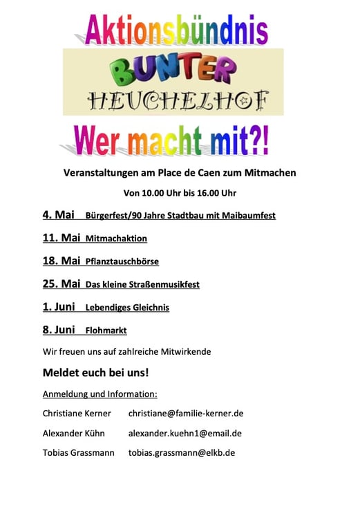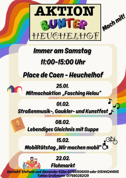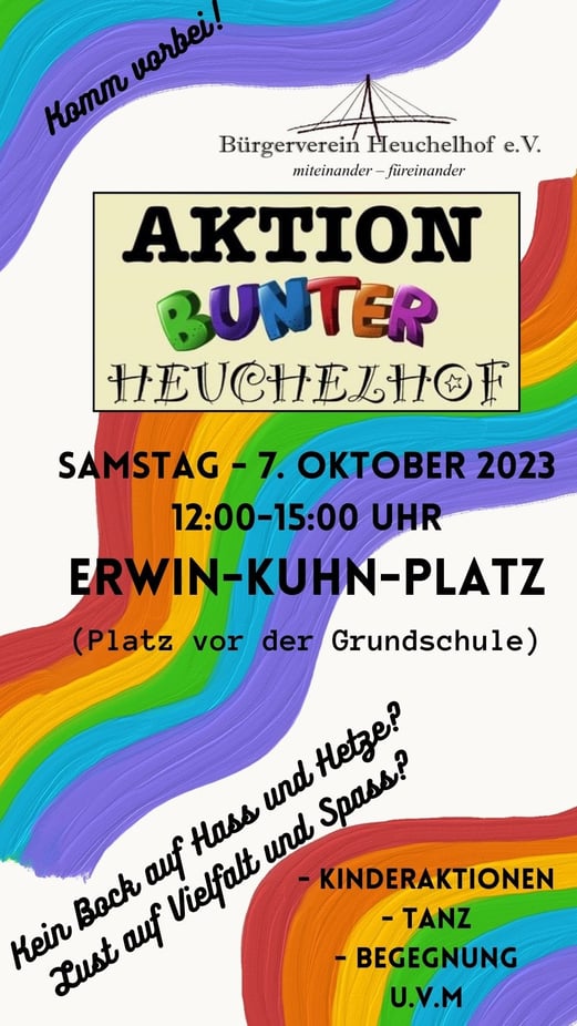 „Aktion bunter Heuchelhof“ - so der Name der spontan von Mitgliedern des BVH und Pfarrer Tobias Graßmann ins Leben gerufenen Veranstaltung auf dem Erwin-Kuhn-Platz. Es sollte eine Gegendarstellung sein zum Bild einer einsamen „blauen Insel“, wie es ZEIT online ausgehend von den Wahlergebnissen der Bundestagswahlen gezeichnet hatte. Von einem „Mikrokosmos, gerade für viele sozial Abgehängte“, dazu „umschlossen von schwer zu überwindenden Straßen“ war in diesem Artikel die Rede. Doch unser Stadtteil ist anders und bunter, wie sich an diesem Samstag zeigte! Bereits am Freitag Nachmittag verwandelten die Kinder der OGS Heuchelhof unter der Leitung von Teresa Horn und Claudia Görde den Place de Caen von einer grauen Asphaltfläche zum bunten Bilderteppich.